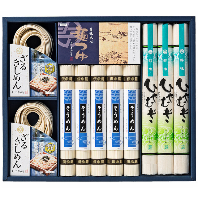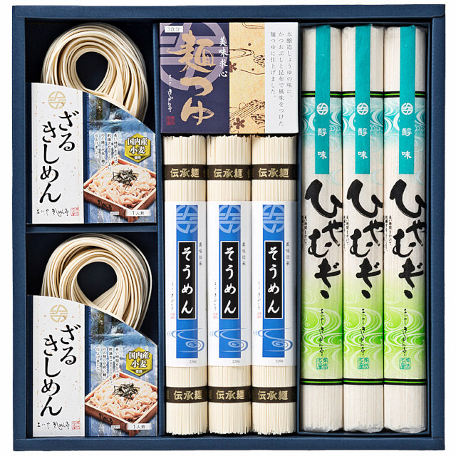 商品説明: つるつるしこしこした手折り麺の「きしめん」と長時間乾燥で仕上げたのどごしさわやかな「そうめん」「ひやむぎ」の詰合せです。カツオ・昆布のだしの効いた「めんつゆ」でお楽しみください。